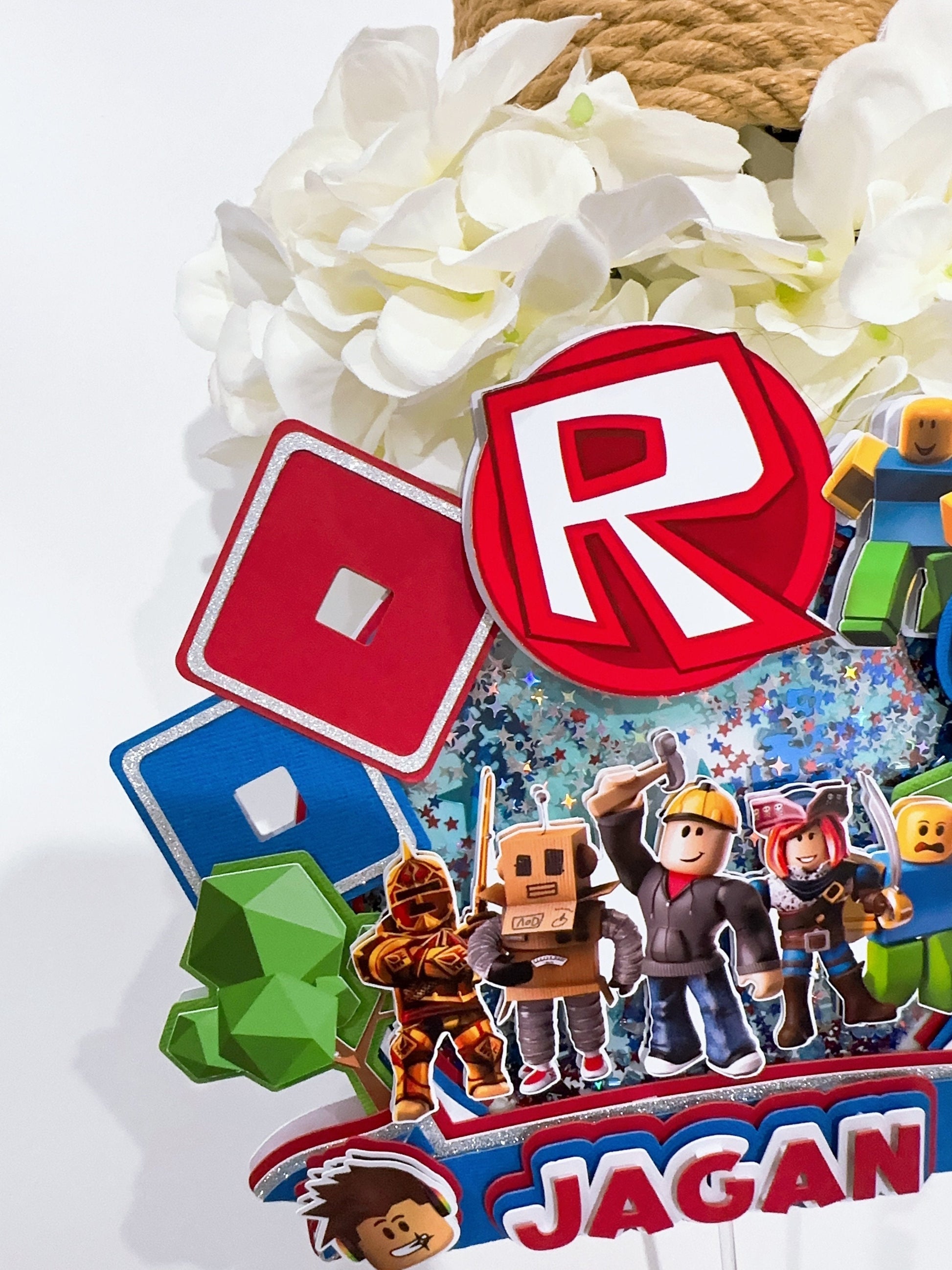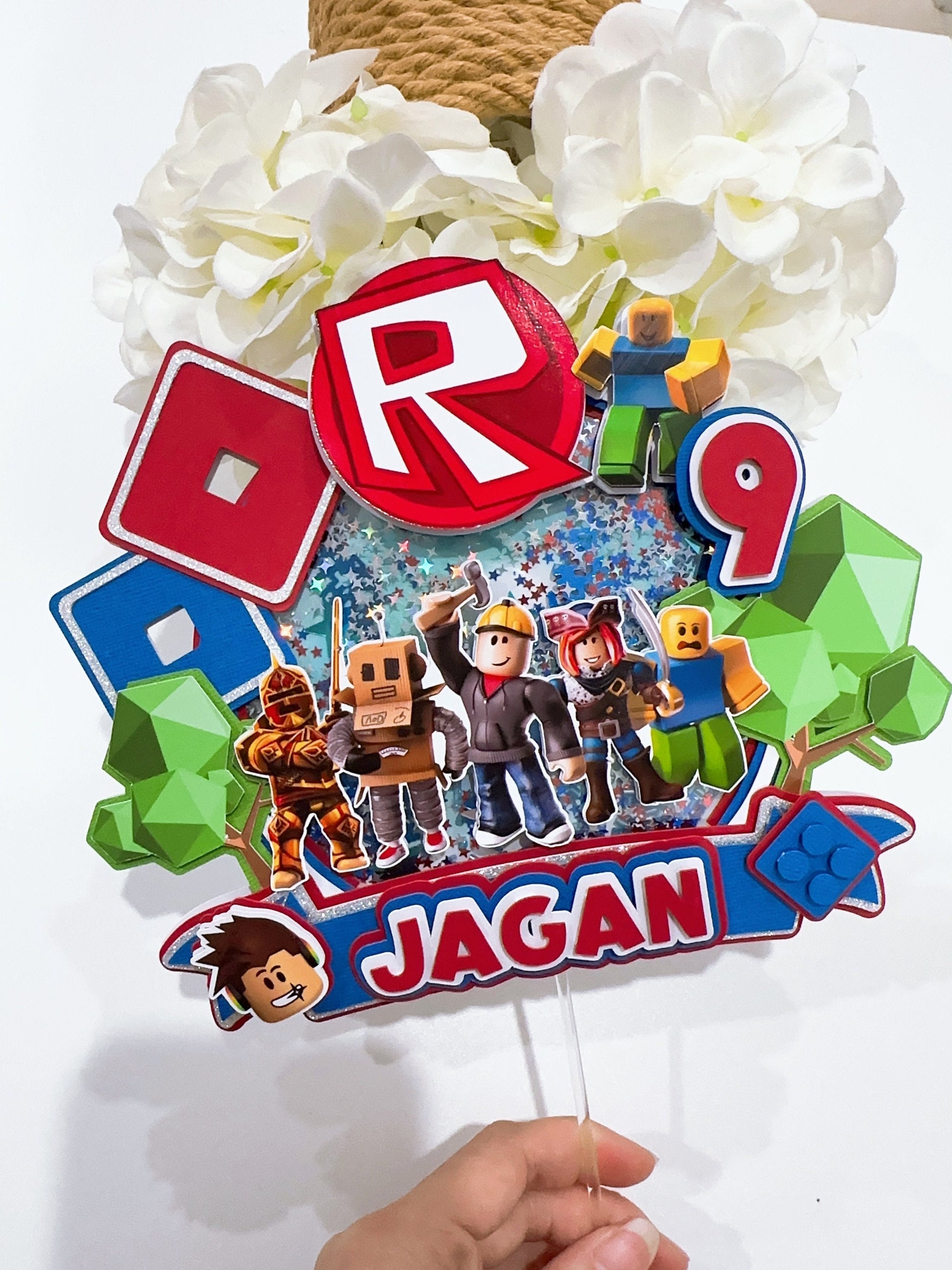 This handmade Blue Roblox themed 3D shaker cake topper is a great way to add a sparkle to your child's cake. You can personalize this cake topper by adding the name of the birthday child. A different and fun shaker topper with sequins and beads add to a section of the topper to make it more fun. Topper has been made with good quality cardstock, glitter cardstock, and acrylic stick.