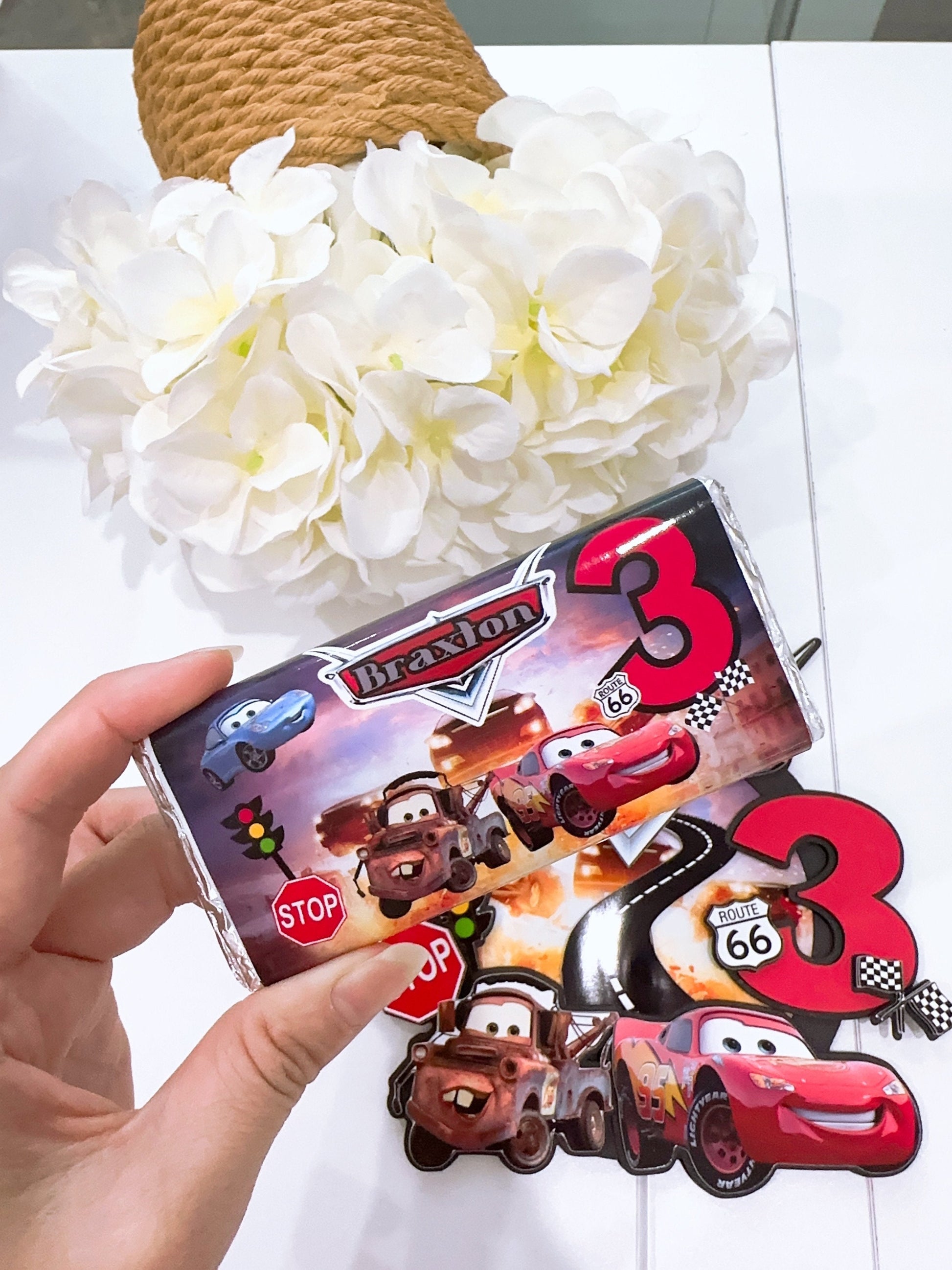 This Cars Chocolate Bar Sticker Wrappers is a great way to add a wow factor to your child's party. You can personalize this design by adding the name and age of the birthday child. These stickers are for 40g Mini Chocolate Bars. Stickers are being made with quality waterproof sticker paper and high-quality printing.