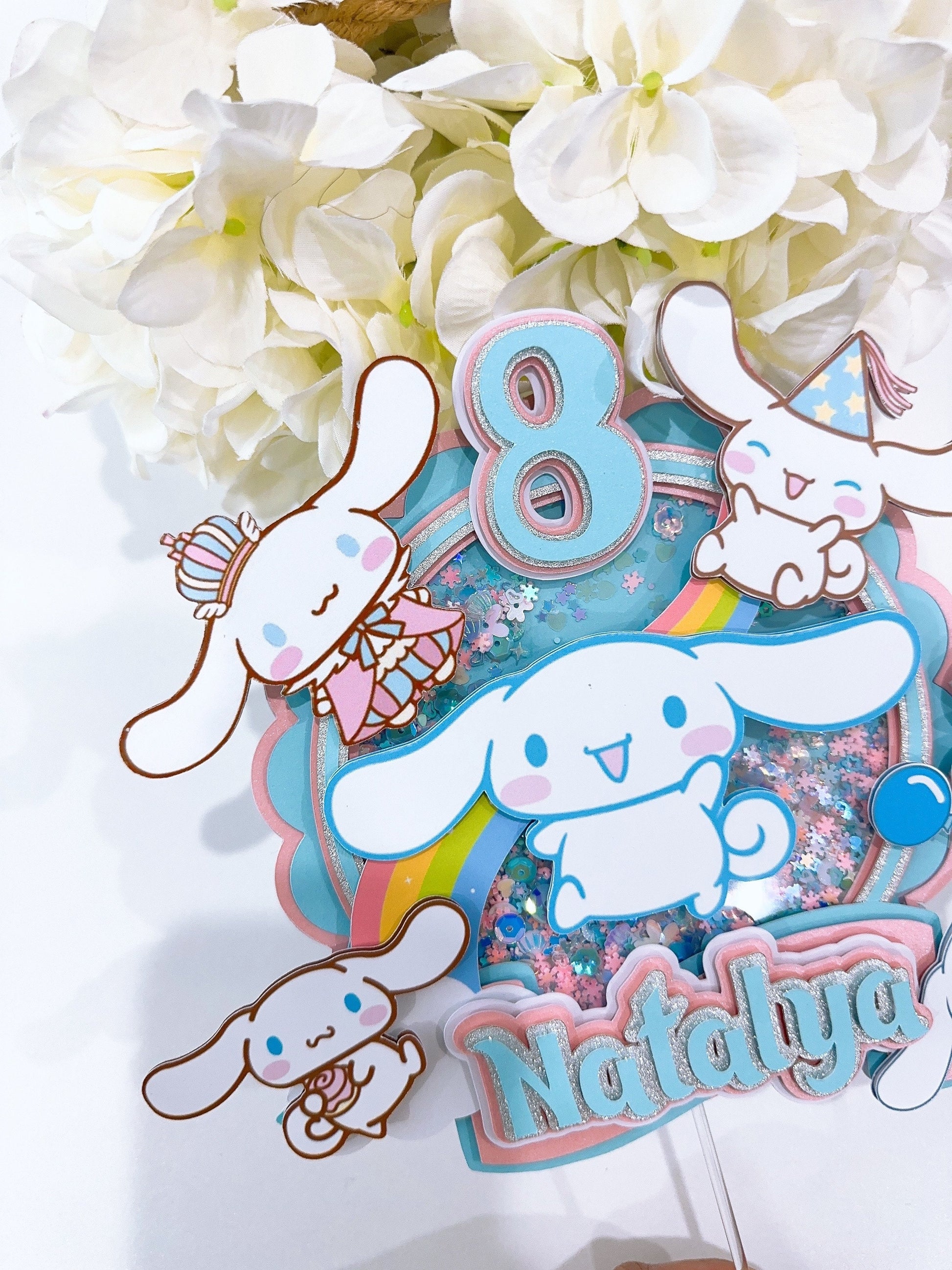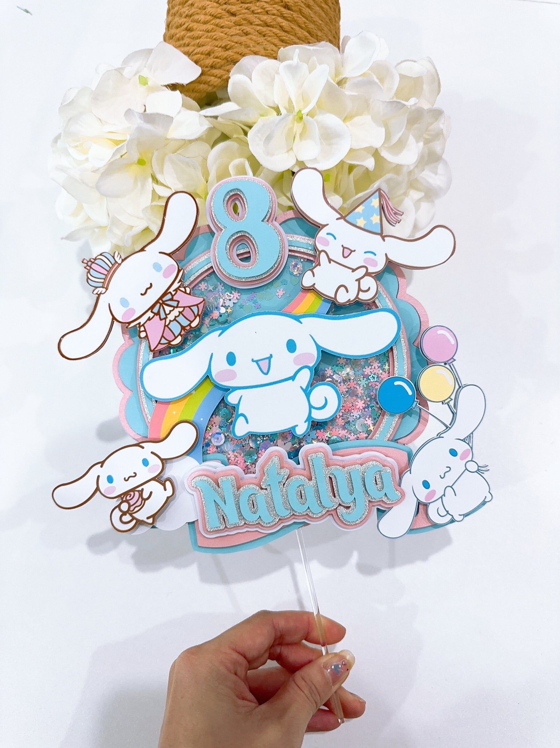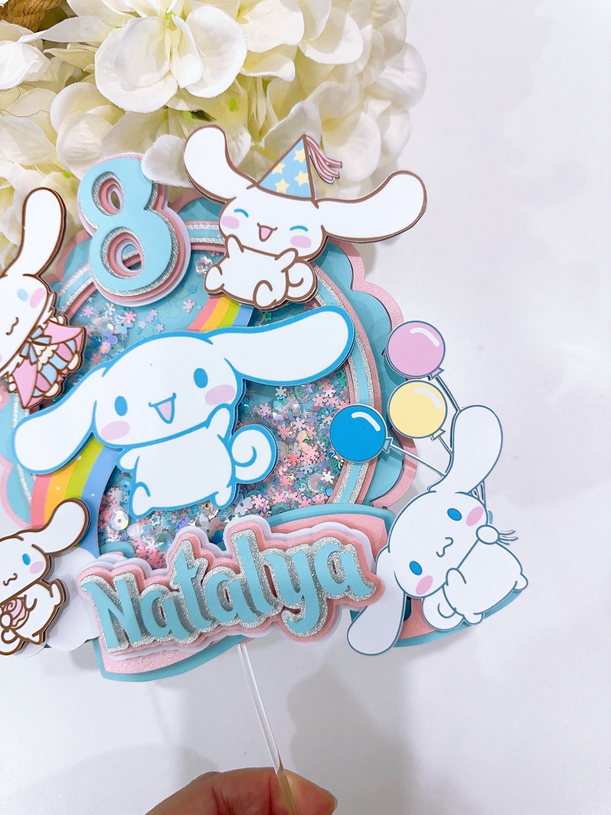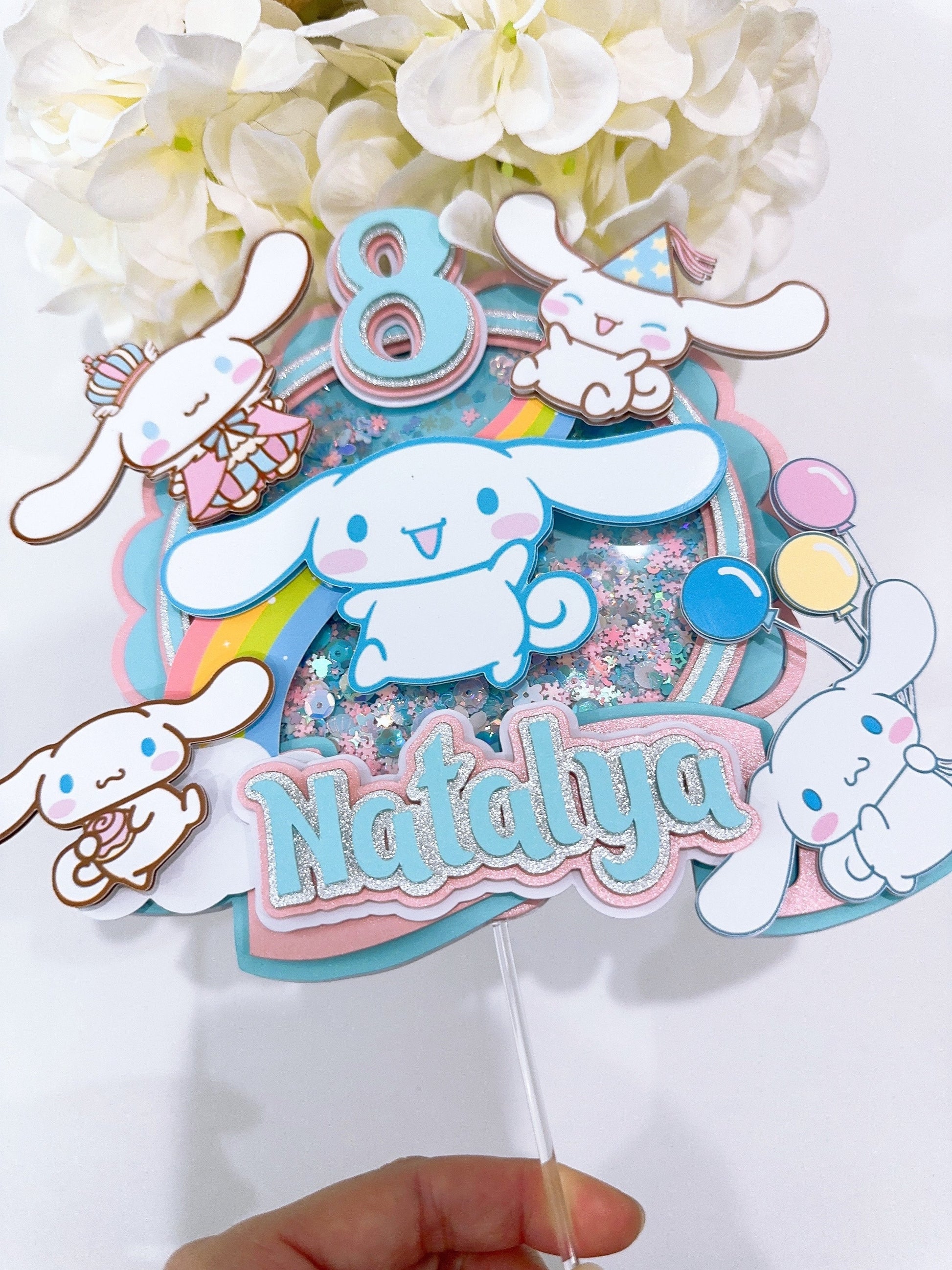 This handmade CinnamonRoll cake topper is a great way to add a sparkle to your child's cake. You can personalize this cake topper by adding the name of the birthday girl. A pretty and cute topper will make any ordinary cake stand out. Topper has been made with good quality cardstock, glitter cardstock, and acrylic stick.