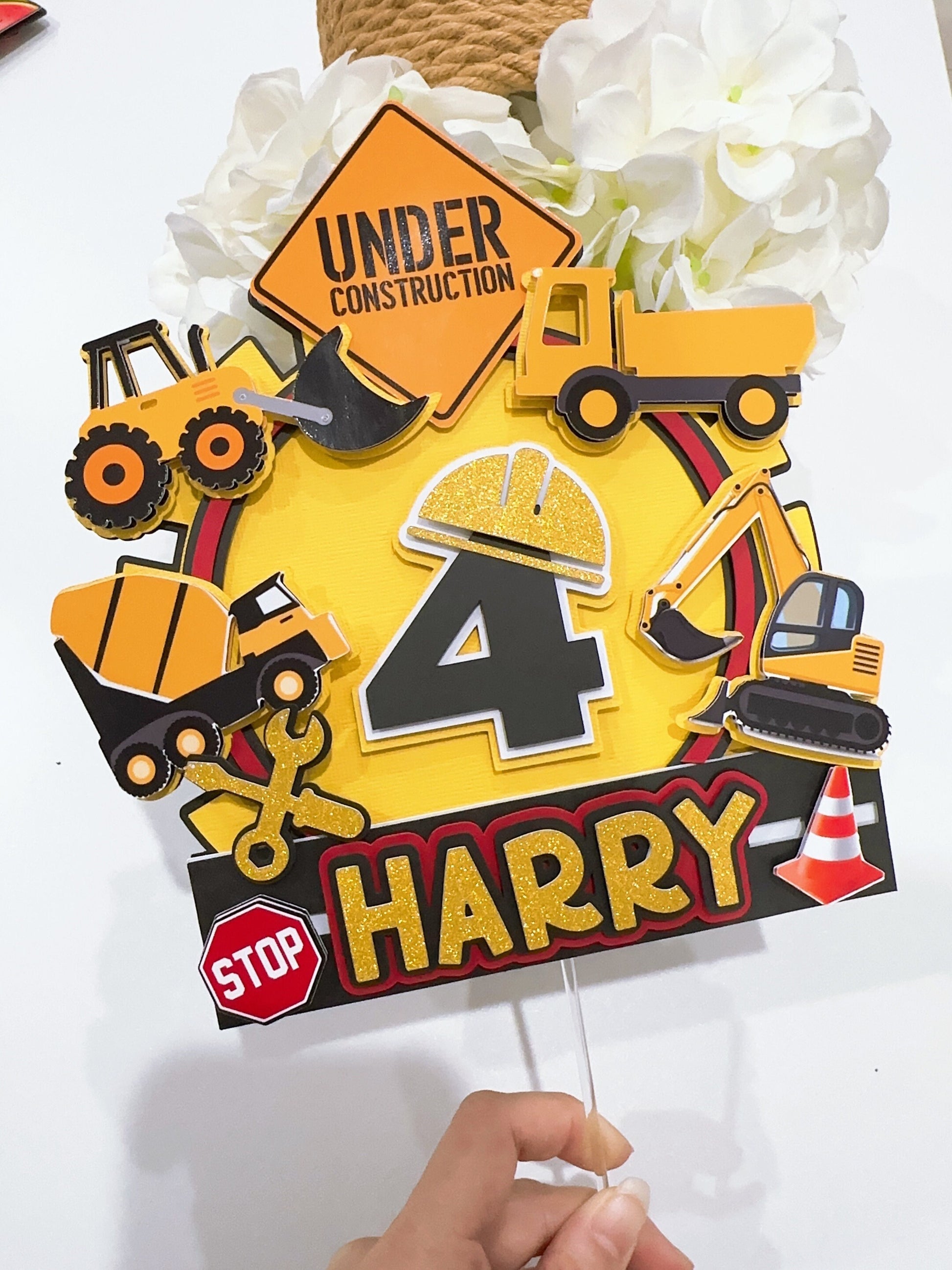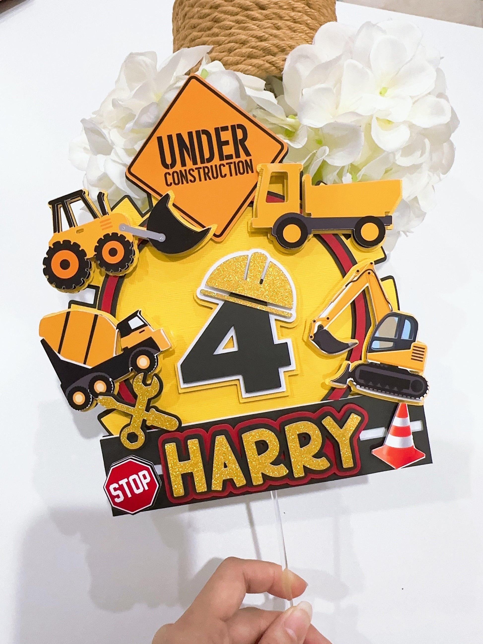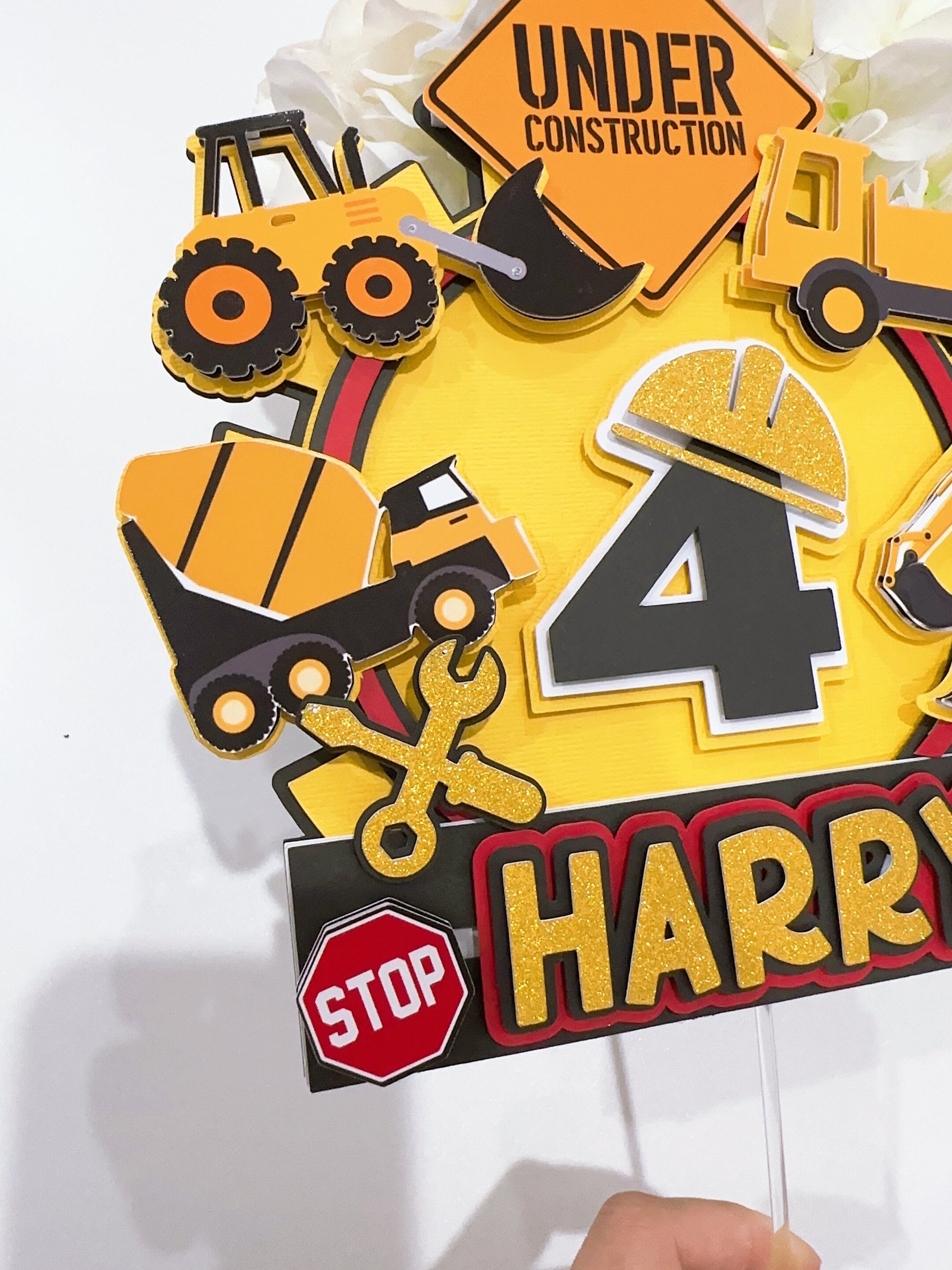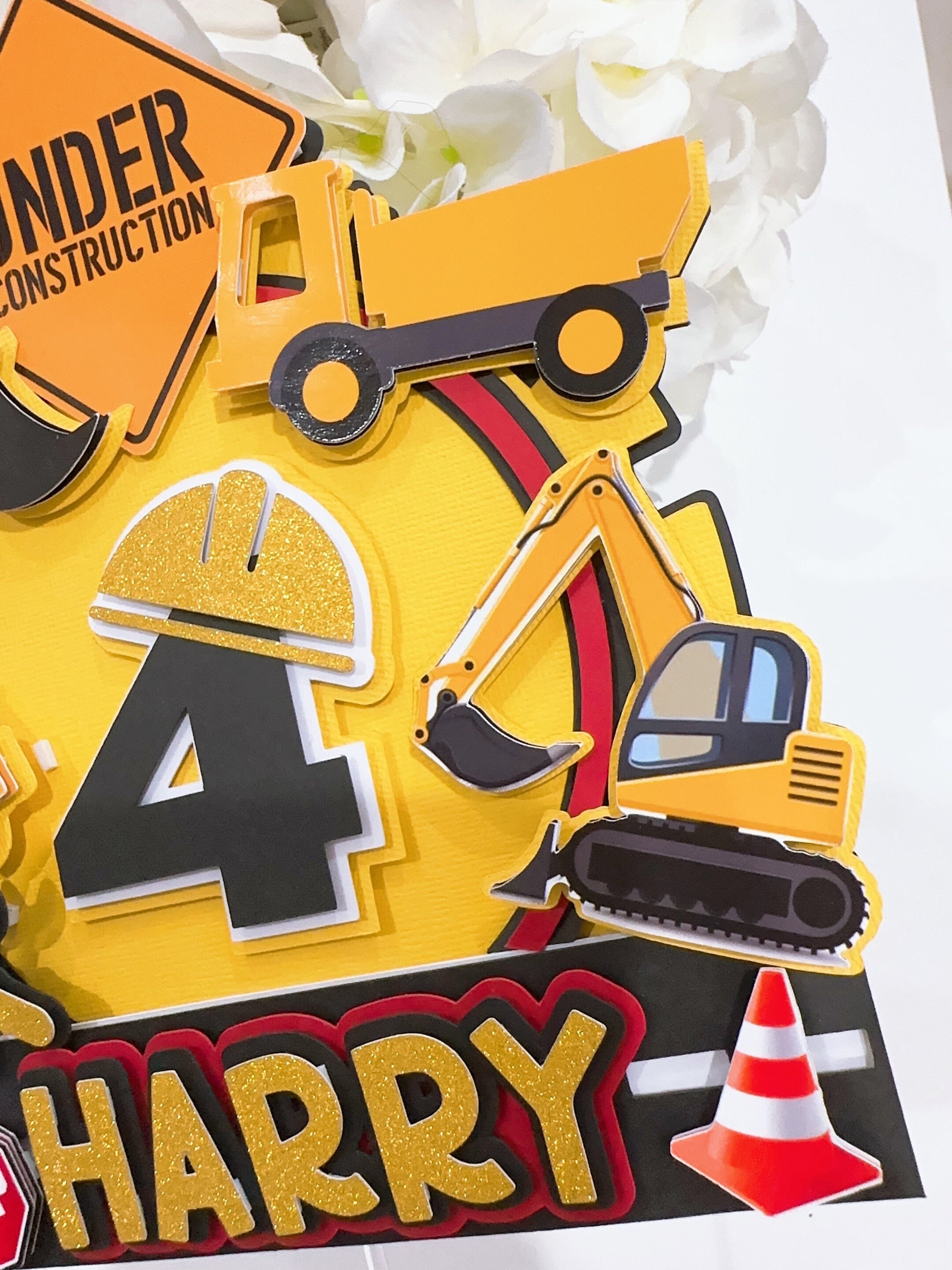 This handmade Construction Cars themed 3D shaker cake topper is a great way to add a sparkle to your child's cake. You can personalize this cake topper by adding the name of the birthday child. A different and fun shaker topper with sequins and beads add to a section of the topper to make it more fun. Topper has been made with good quality cardstock, glitter cardstock, and acrylic stick.