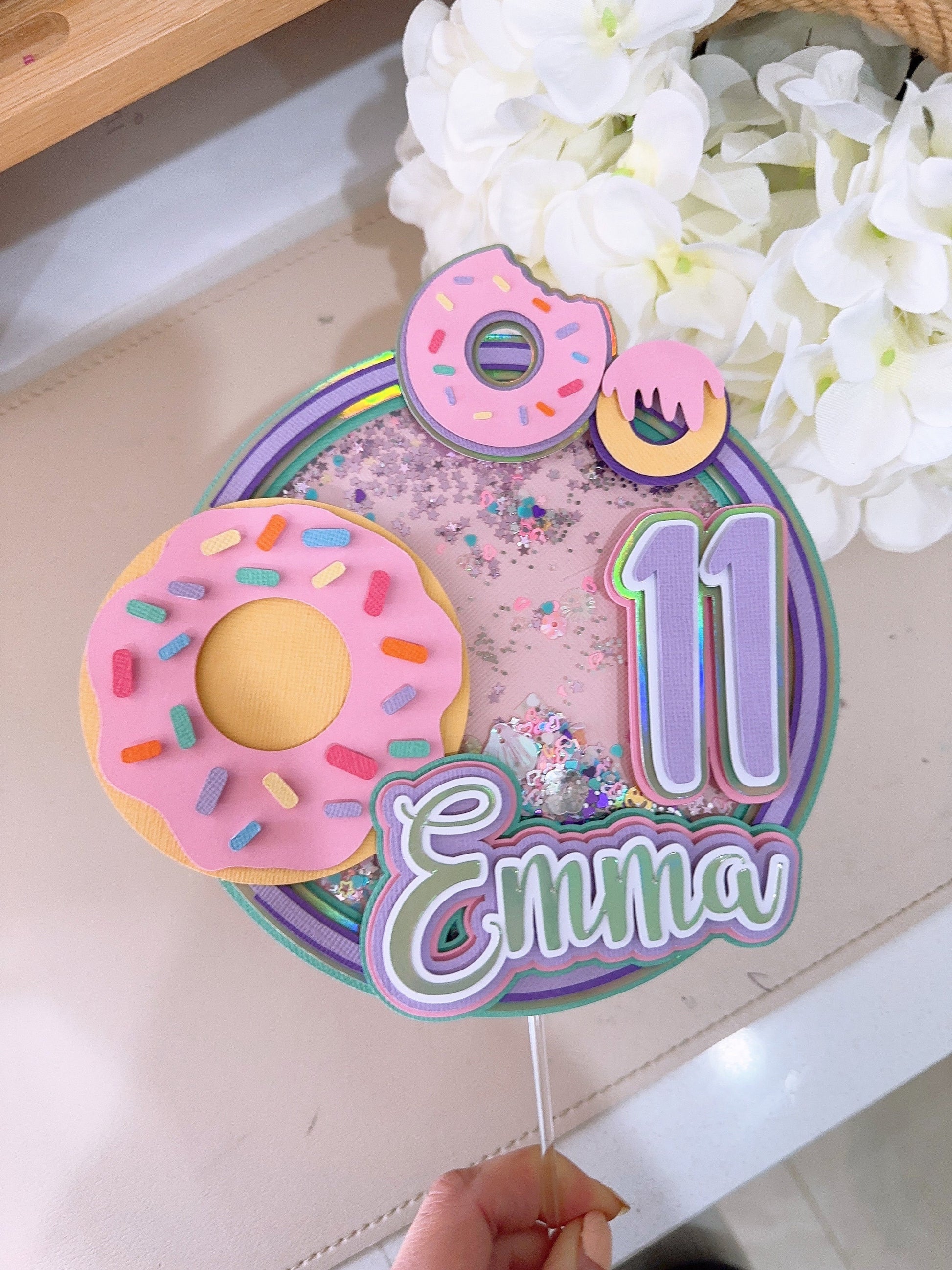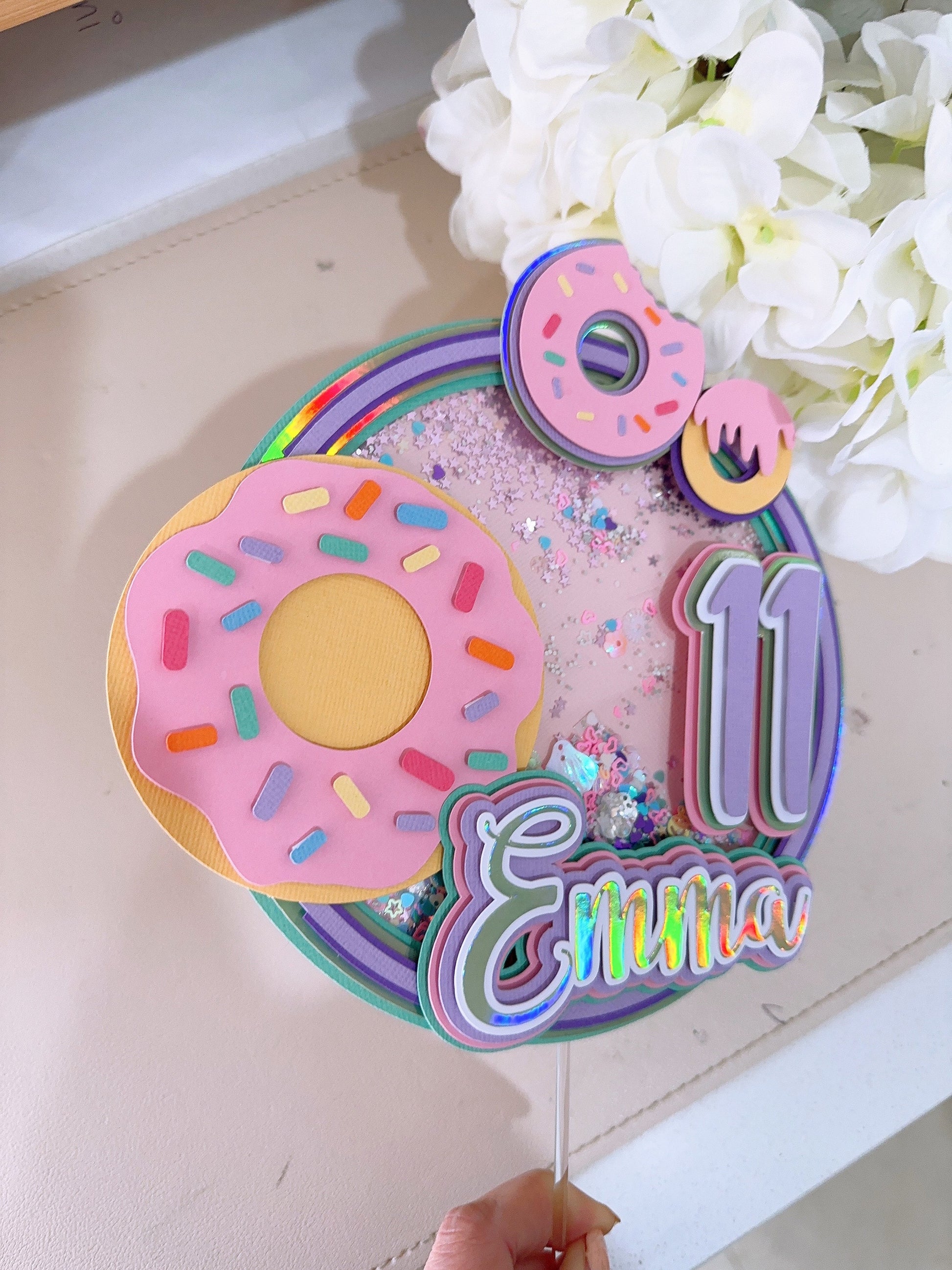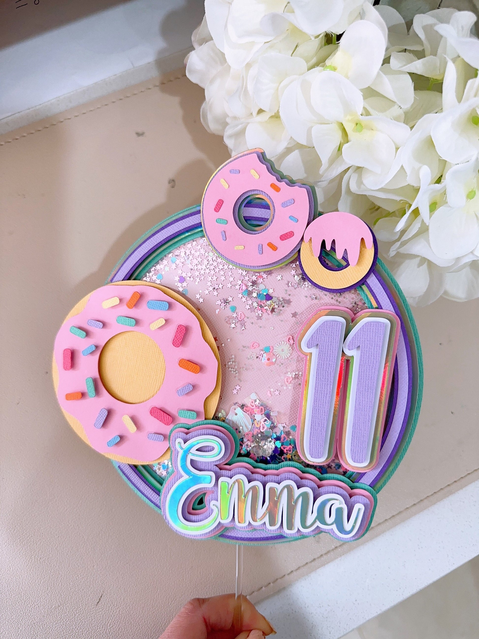 This handmade Girl Donut themed 3D shaker cake topper is a great way to add a sparkle to your child's cake. You can personalize this cake topper by adding the name of the birthday girl. A different and fun shaker topper with sequins and beads add to a section of the topper to make it more fun. Topper has been made with good quality cardstock, glitter cardstock, and acrylic stick.