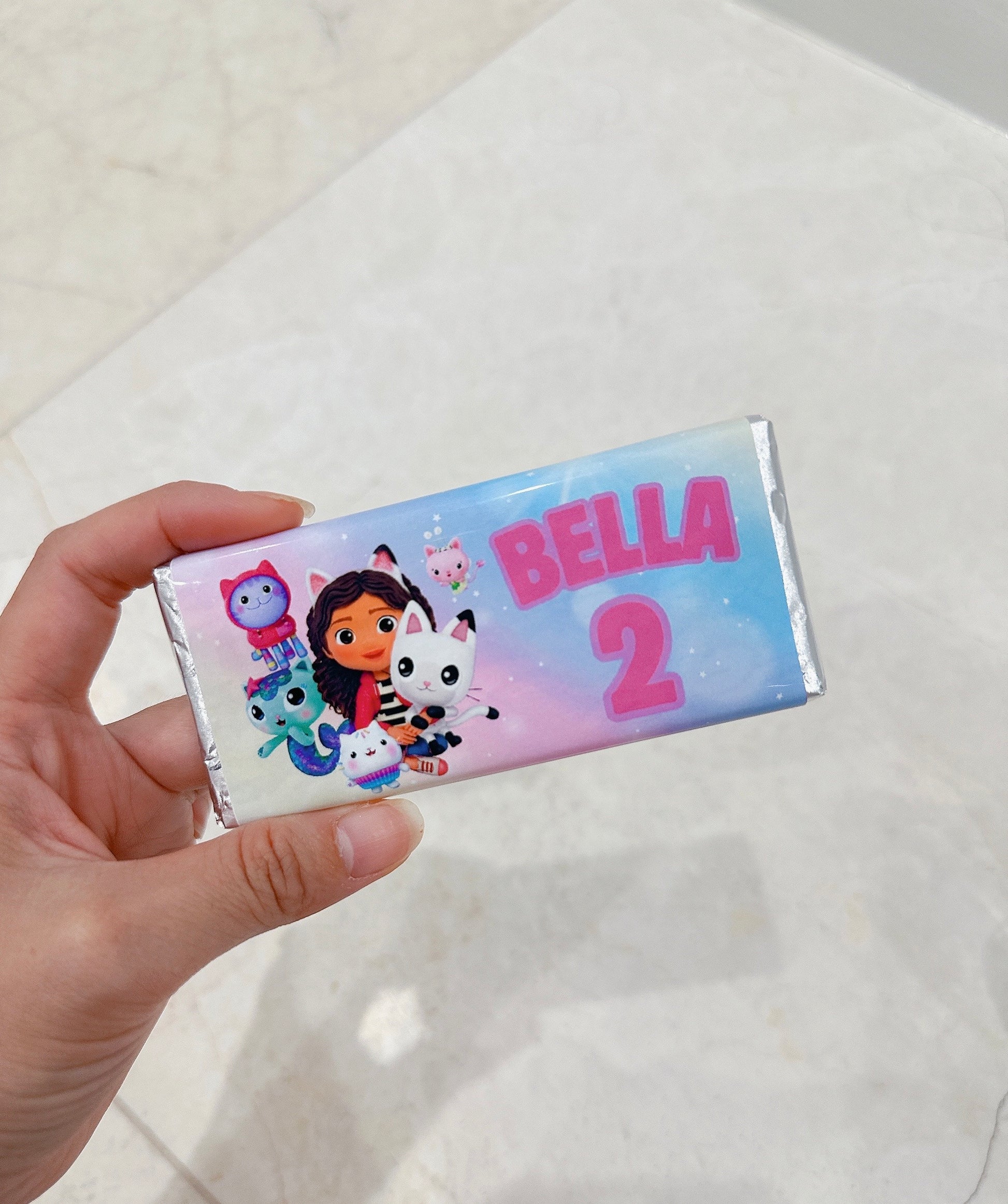 This Gabby Dollhouse Chocolate Bar Sticker Wrappers is a great way to add a wow factor to your child's party. You can personalize this design by adding the name and age of the birthday child. These stickers are for 40g Mini Chocolate Bars. Stickers are being made with quality waterproof sticker paper and high-quality printing.