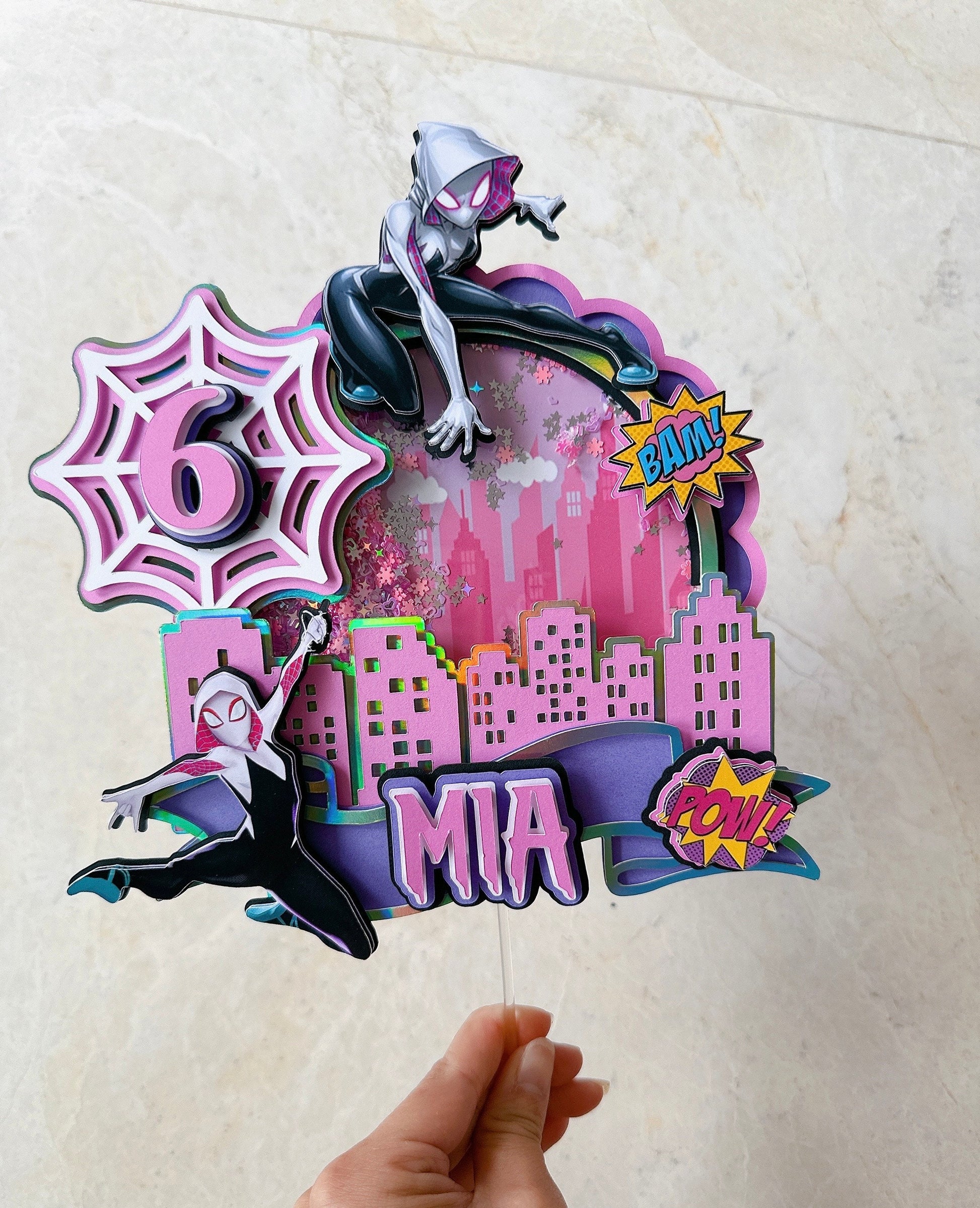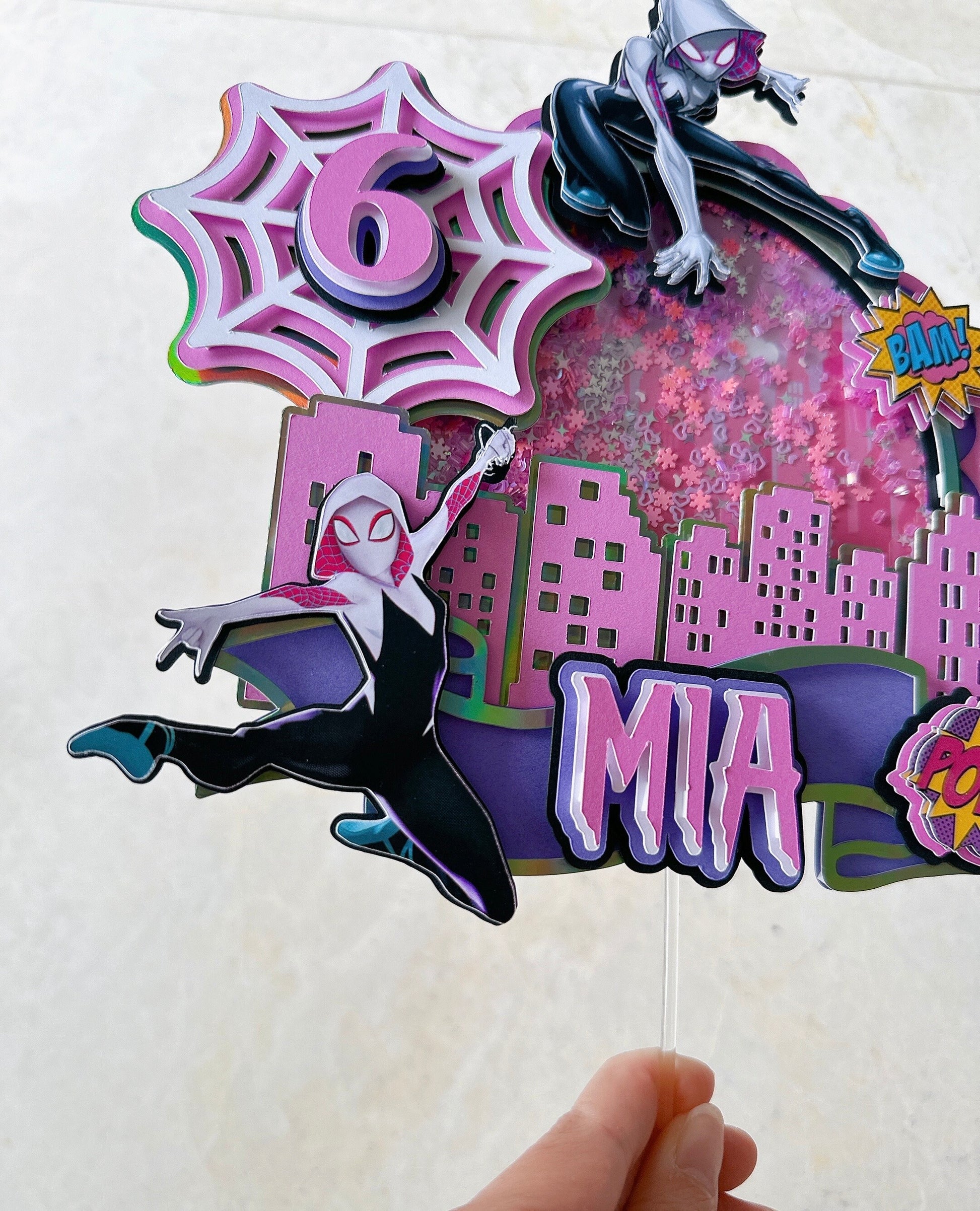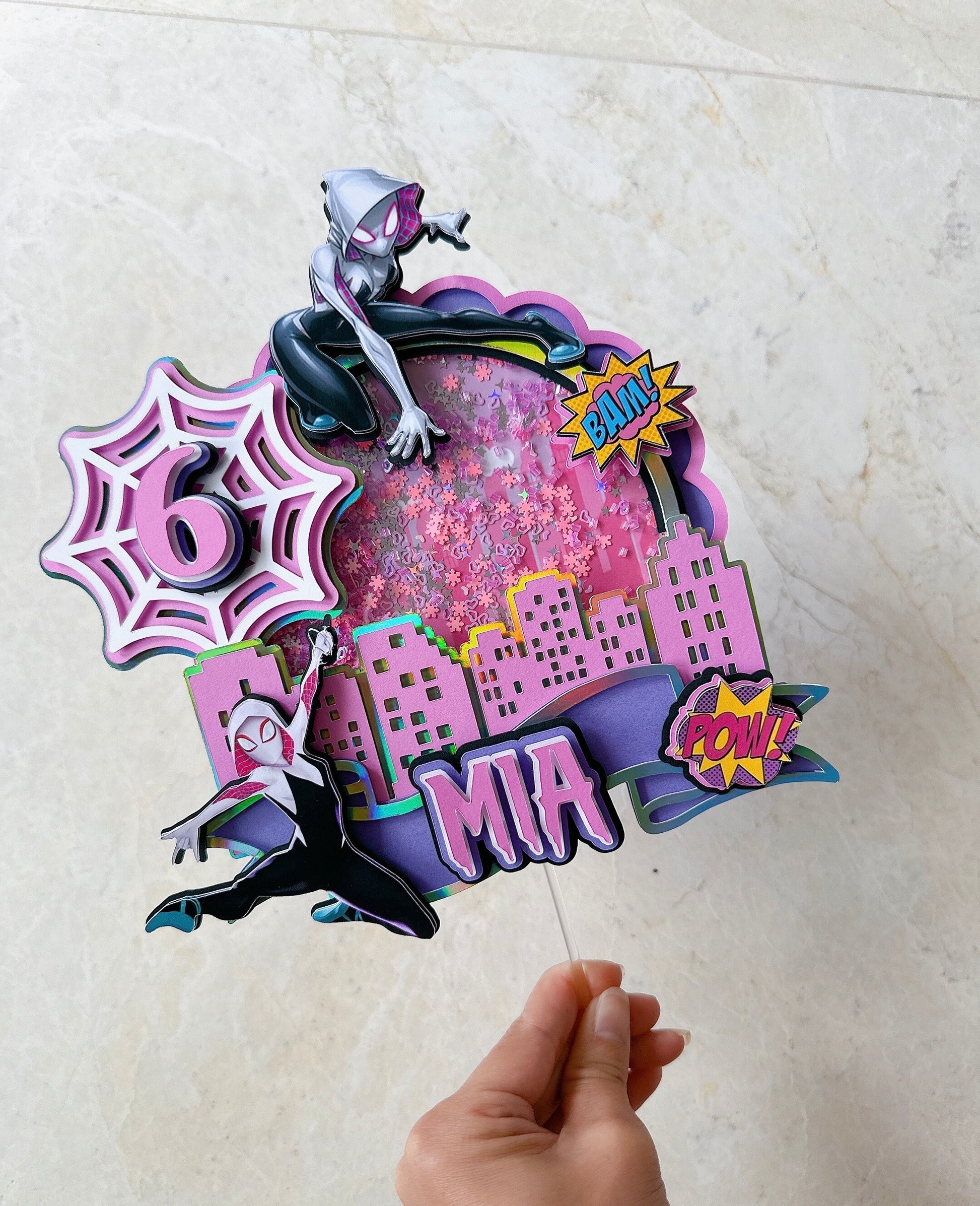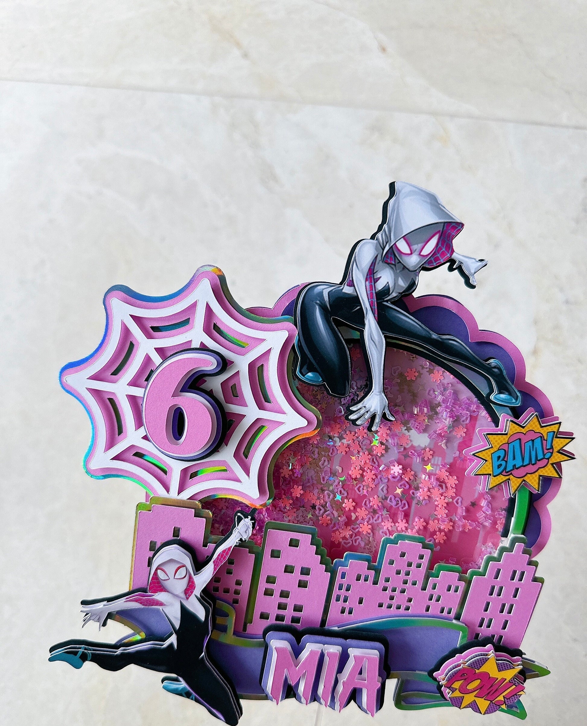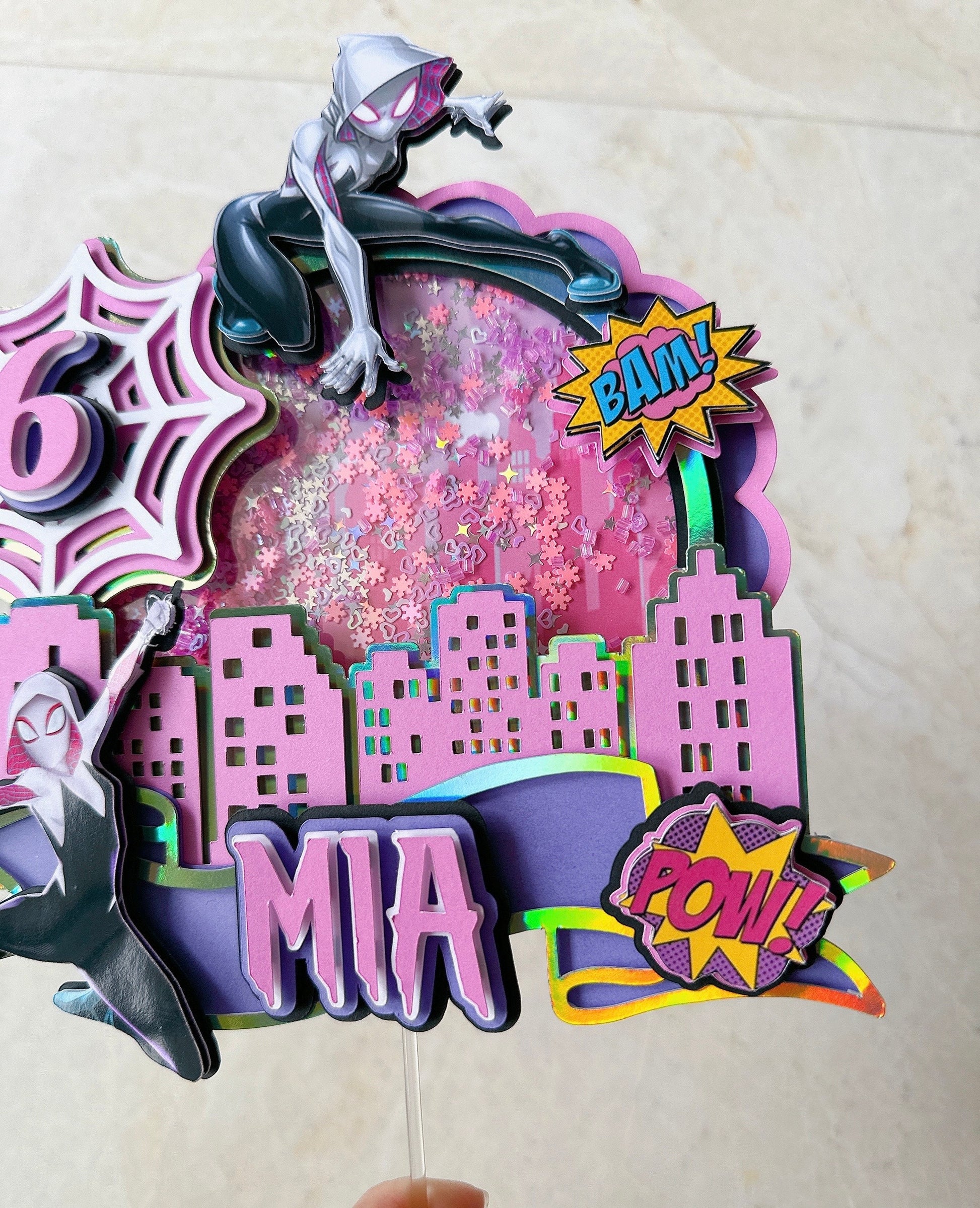 This handmade Gwen cake topper is a great way to add a sparkle to your child's cake. You can personalize this cake topper by adding the name of the birthday girl. A pretty and cute topper will make any ordinary cake stand out. Topper has been made with good quality cardstock, glitter cardstock, and acrylic stick.