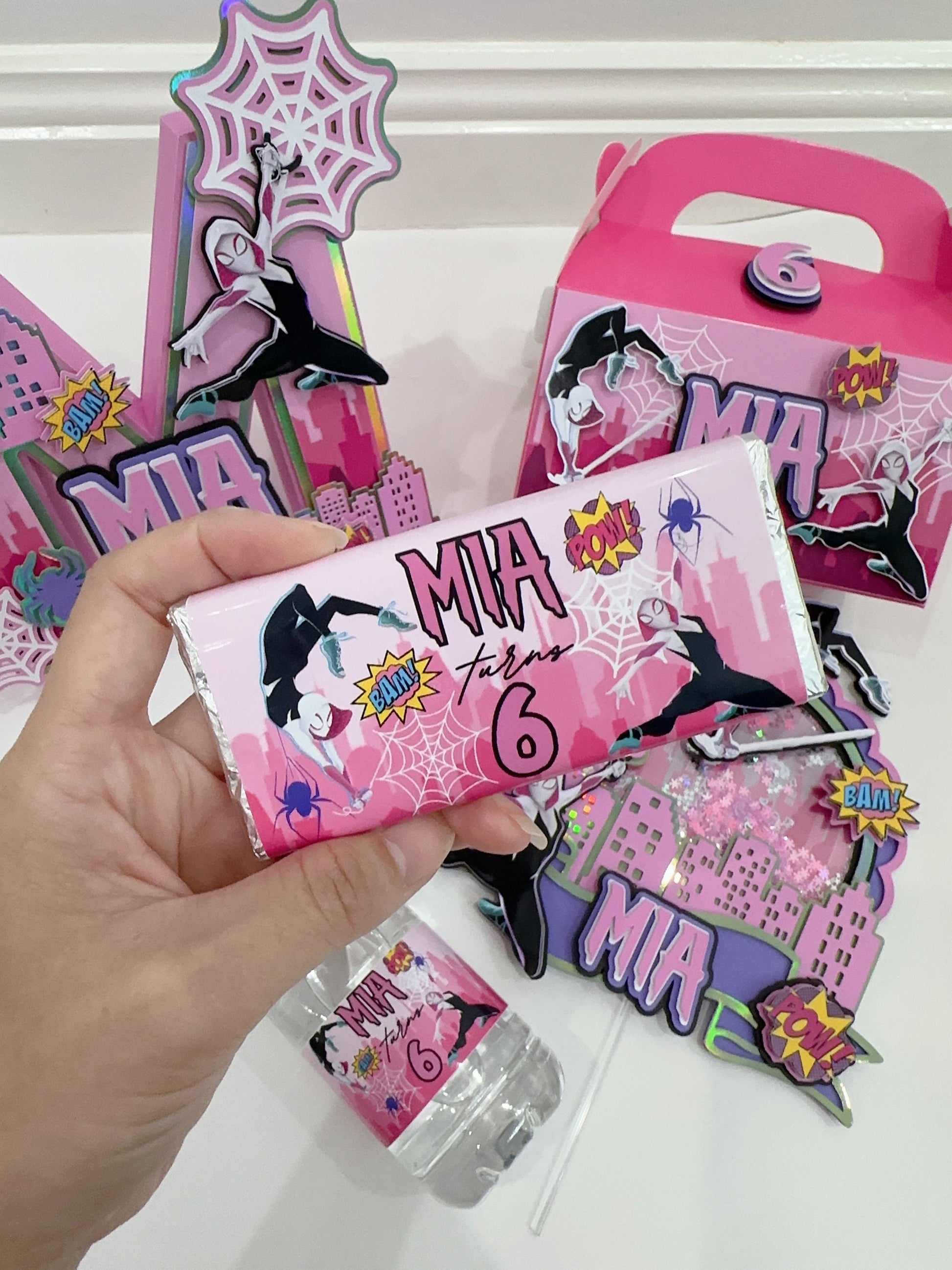 This Gwen Stacey Spidergirl Chocolate Bar Sticker Wrappers is a great way to add a wow factor to your child's party. You can personalize this design by adding the name and age of the birthday child. These stickers are for 40g Mini Chocolate Bars. Stickers are being made with quality waterproof sticker paper and high-quality printing.