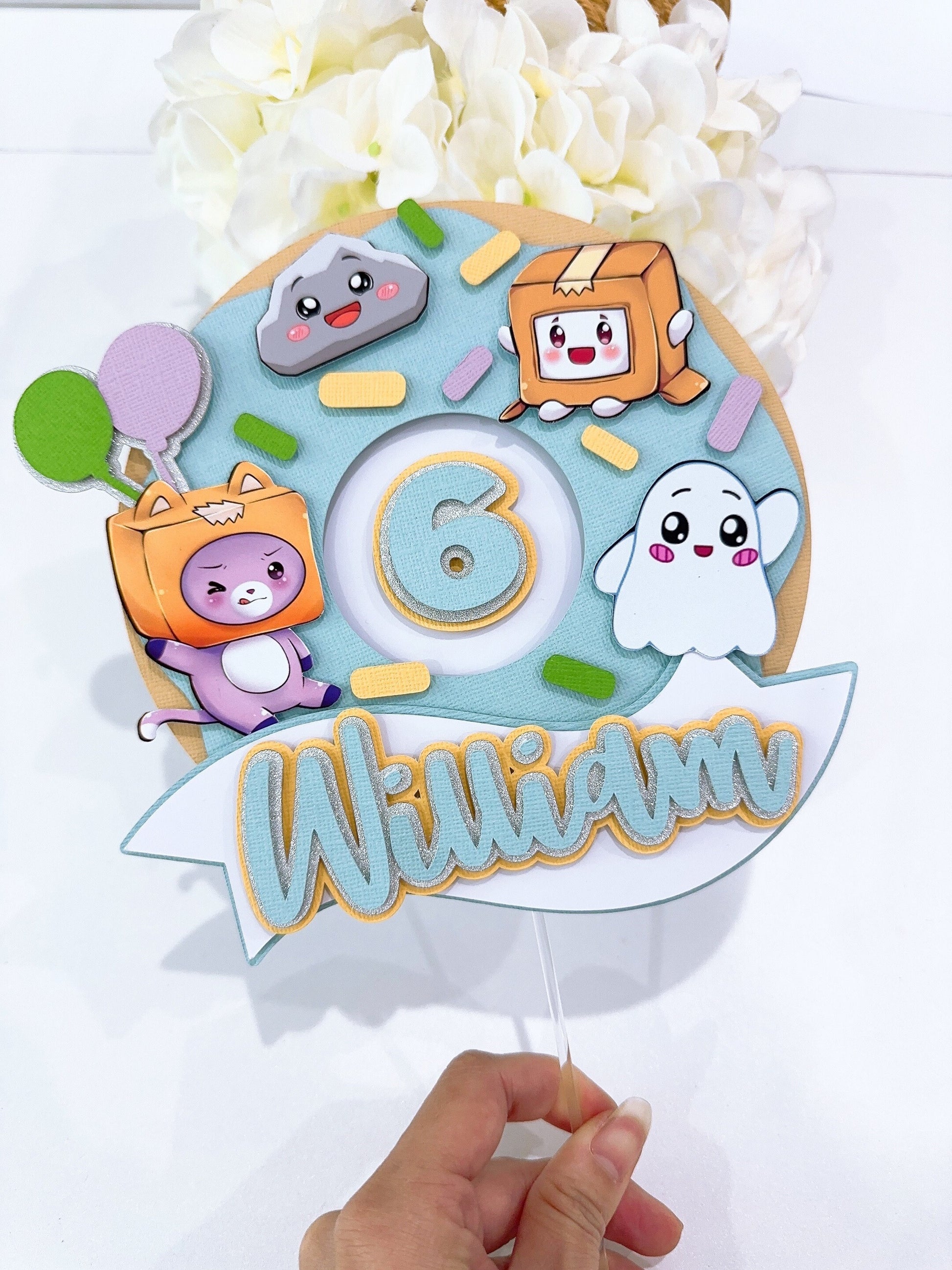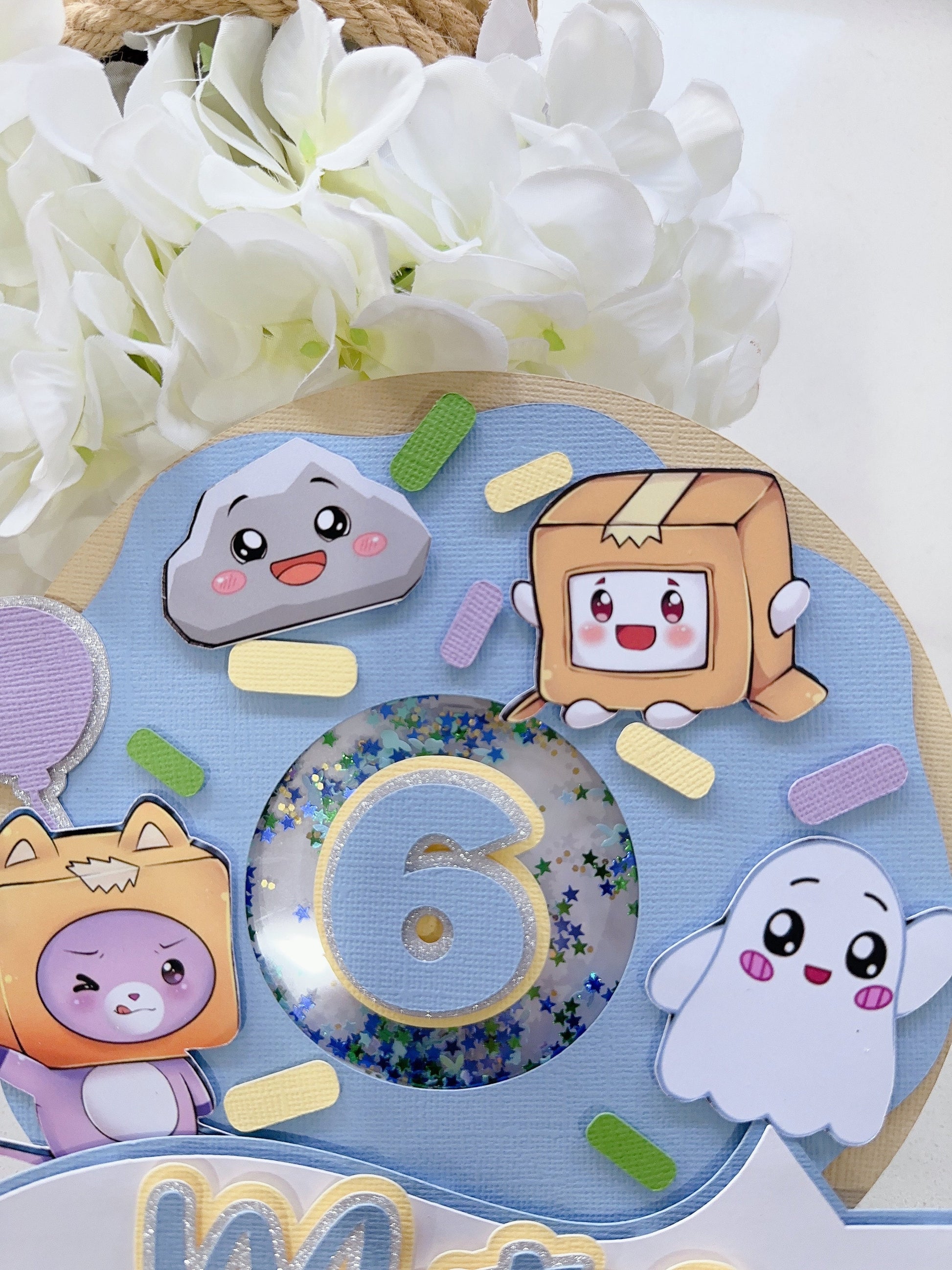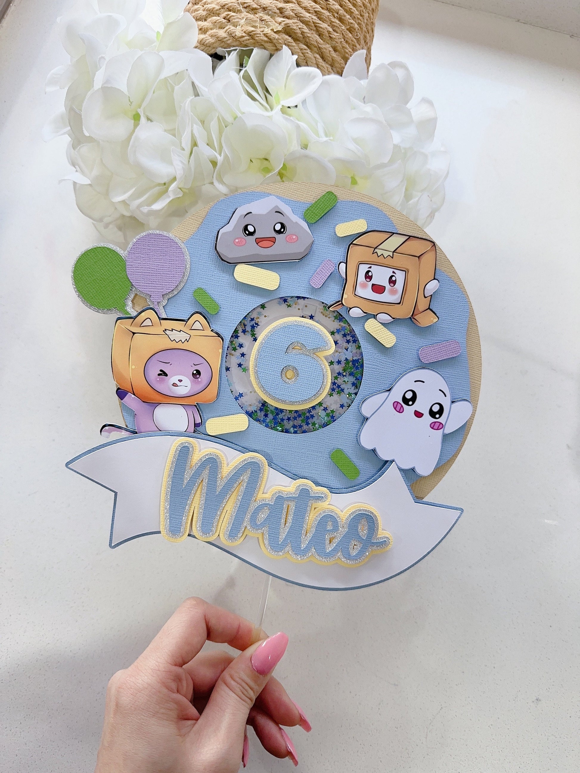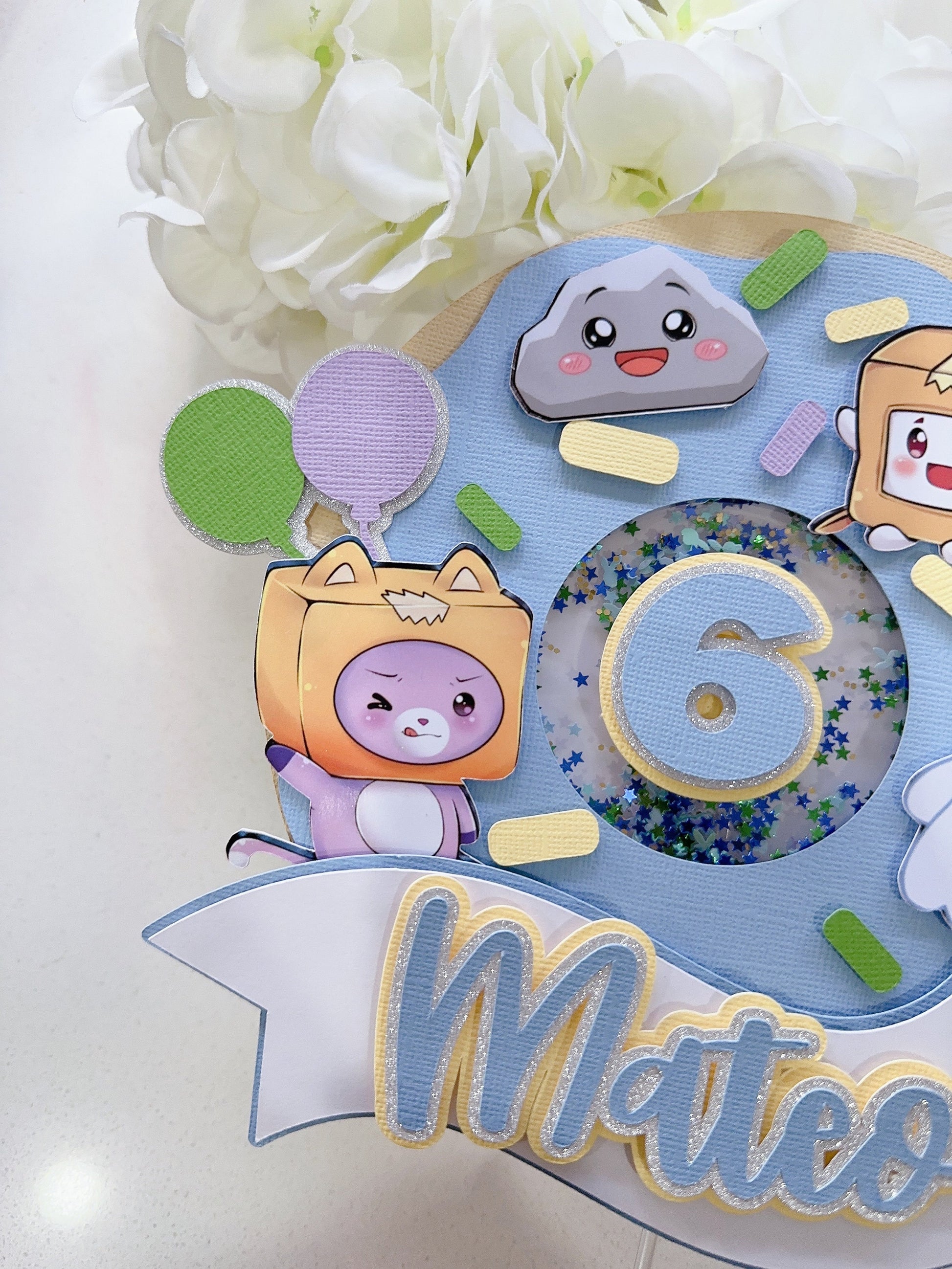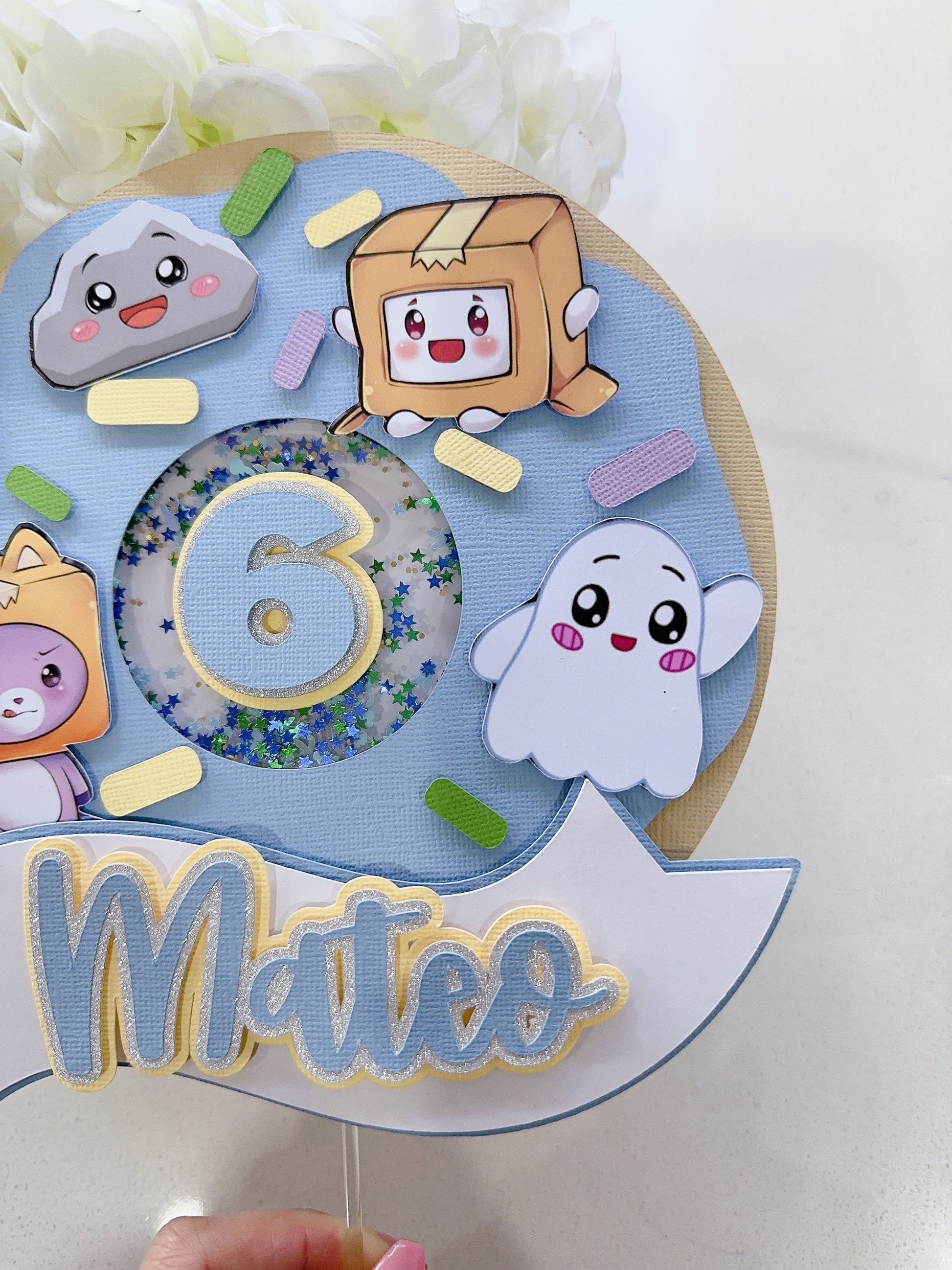 This handmade Lanky Box 3D shaker cake topper is a great way to add a sparkle to your child's cake. You can personalize this cake topper by adding the name of the birthday child. A different and fun shaker topper with sequins and beads add to a section of the topper to make it more fun. Topper has been made with good quality cardstock, glitter cardstock, and acrylic stick.