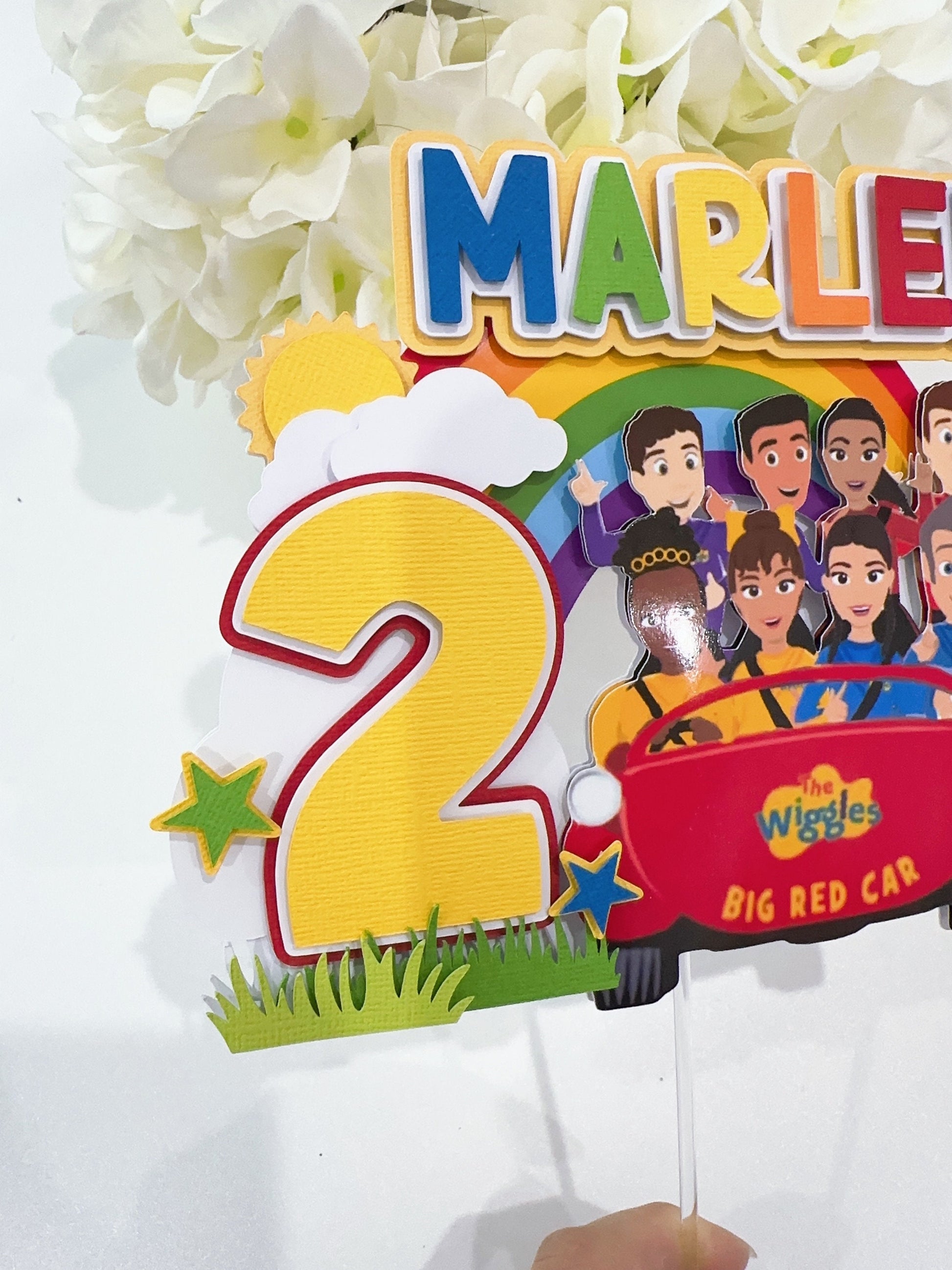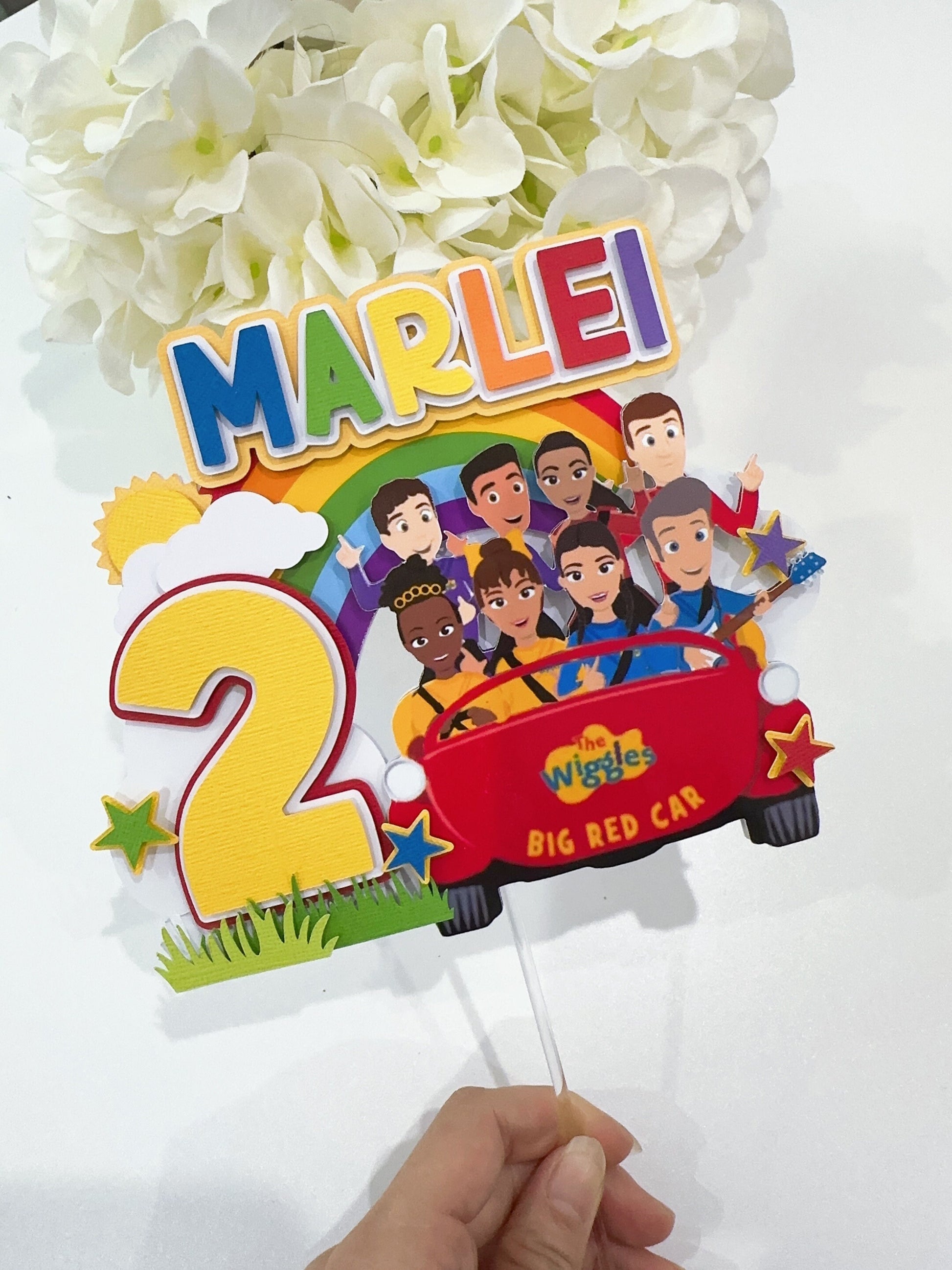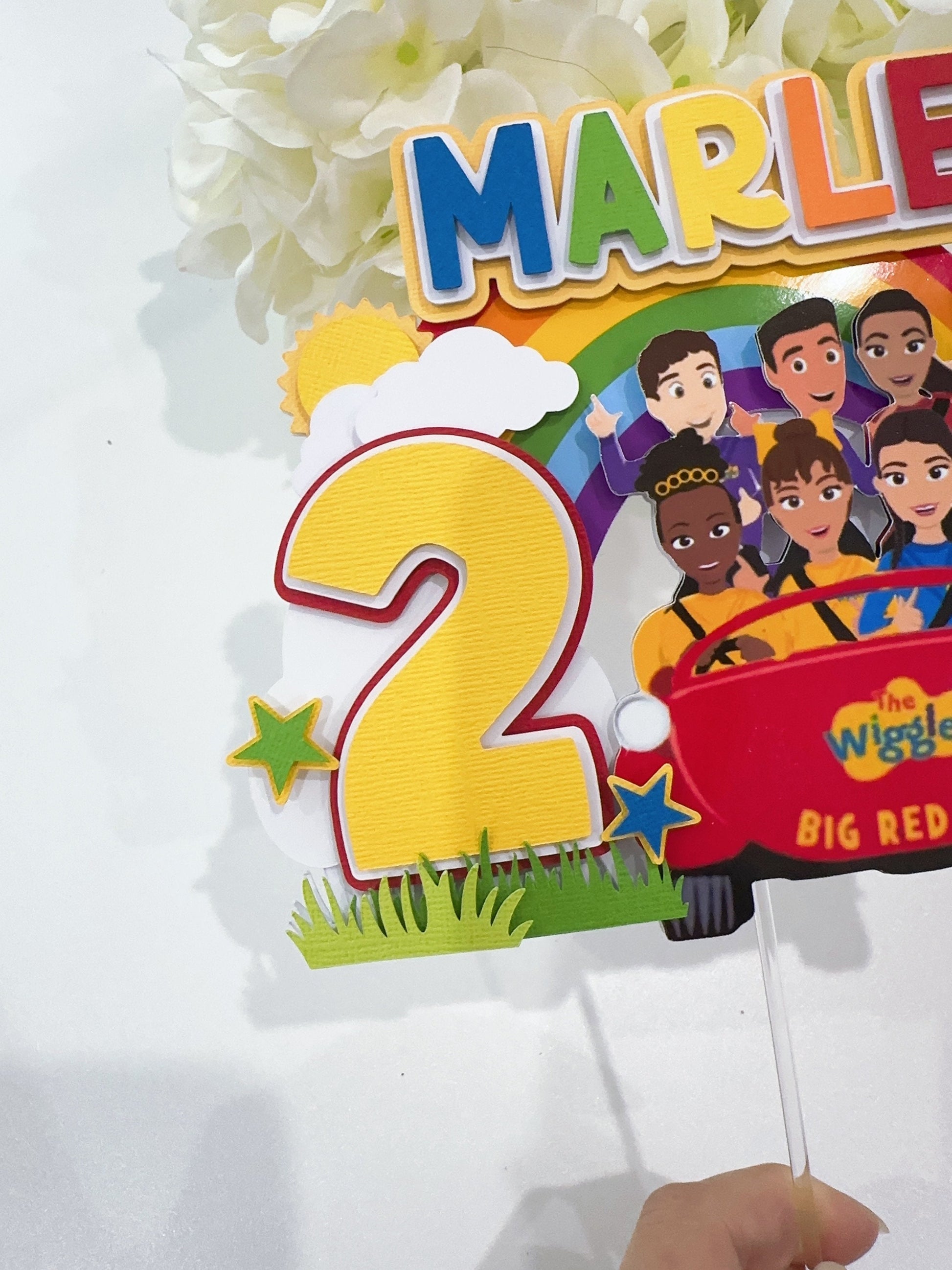 This handmade New Wiggles themed 3D cake topper is a great way to add a sparkle to your child's cake. You can personalize this cake topper by adding the name of the birthday child. Topper has been made with good quality cardstock, glitter cardstock, and acrylic stick.