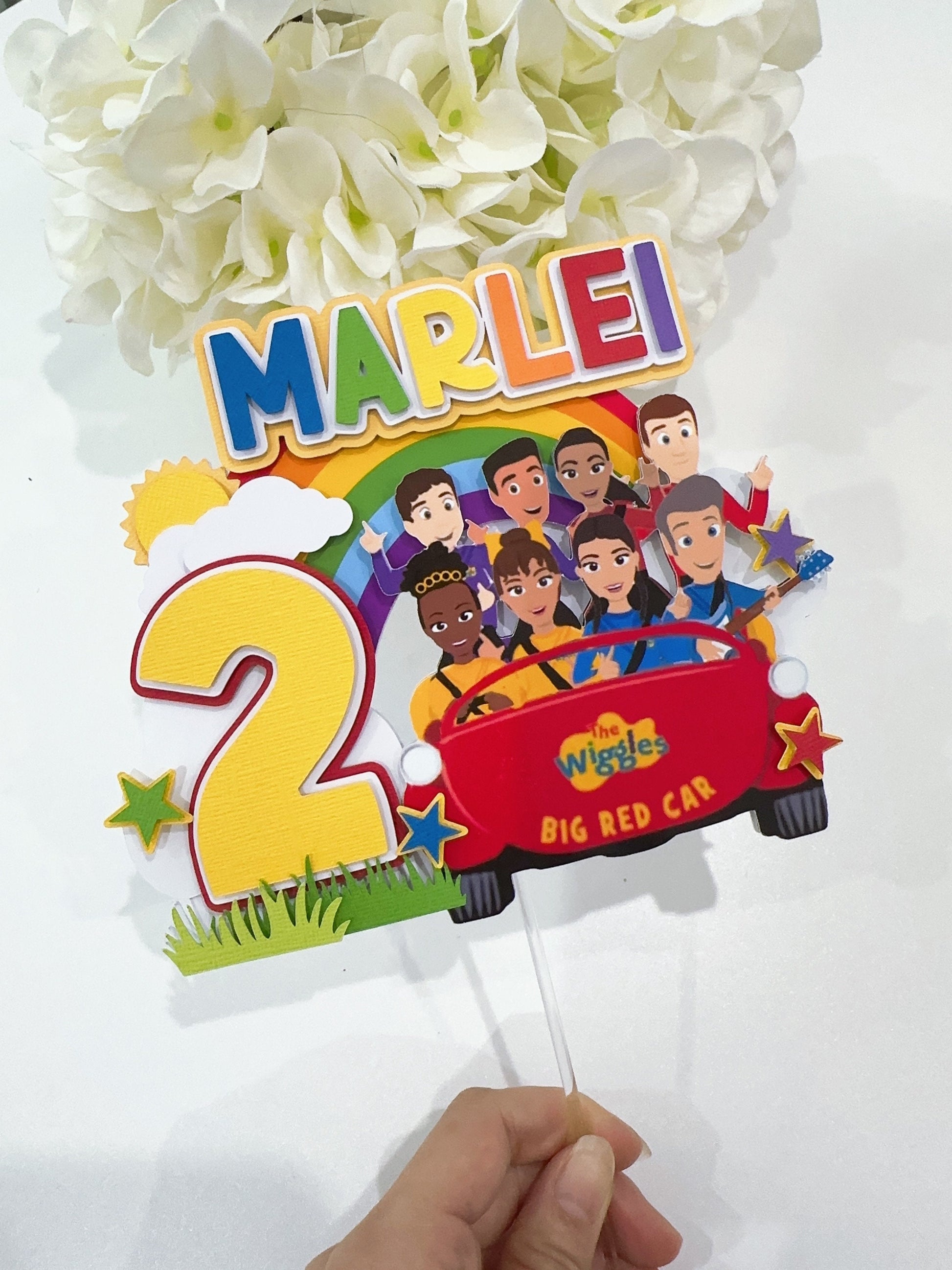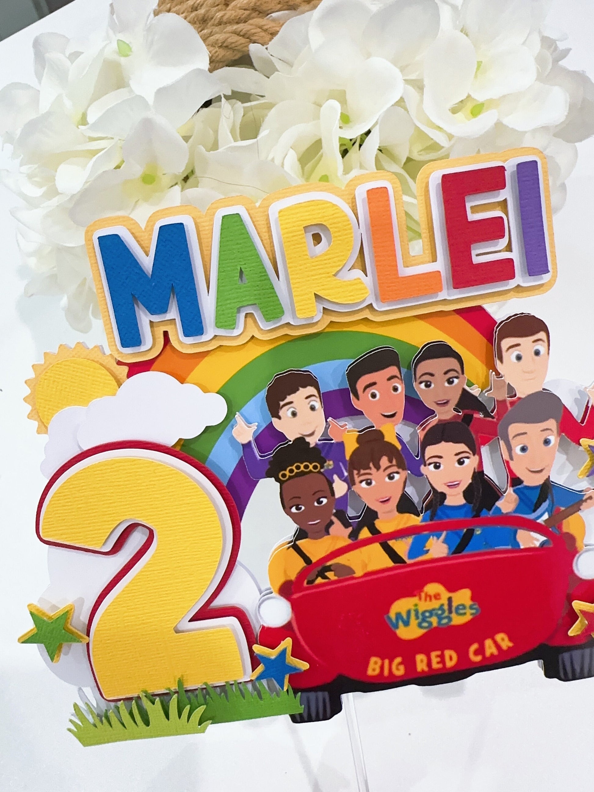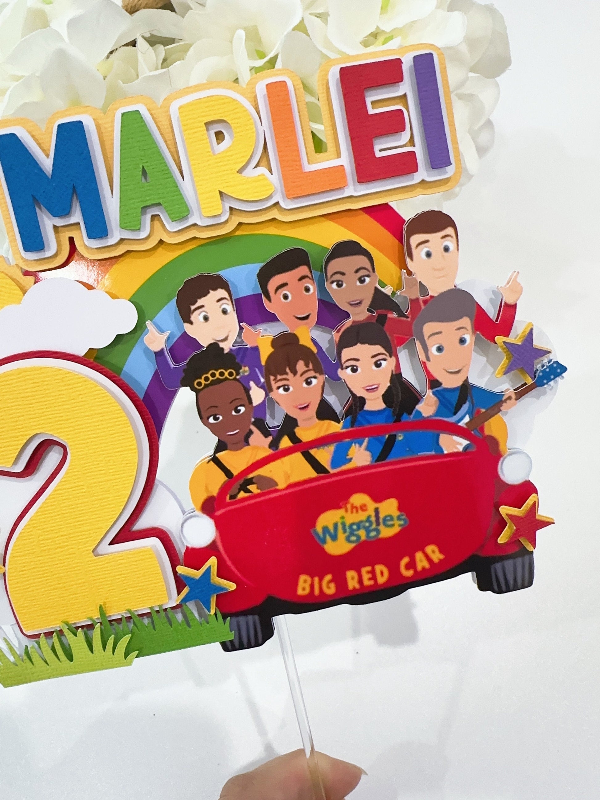 This handmade New Wiggles themed 3D cake topper is a great way to add a sparkle to your child's cake. You can personalize this cake topper by adding the name of the birthday child. Topper has been made with good quality cardstock, glitter cardstock, and acrylic stick.