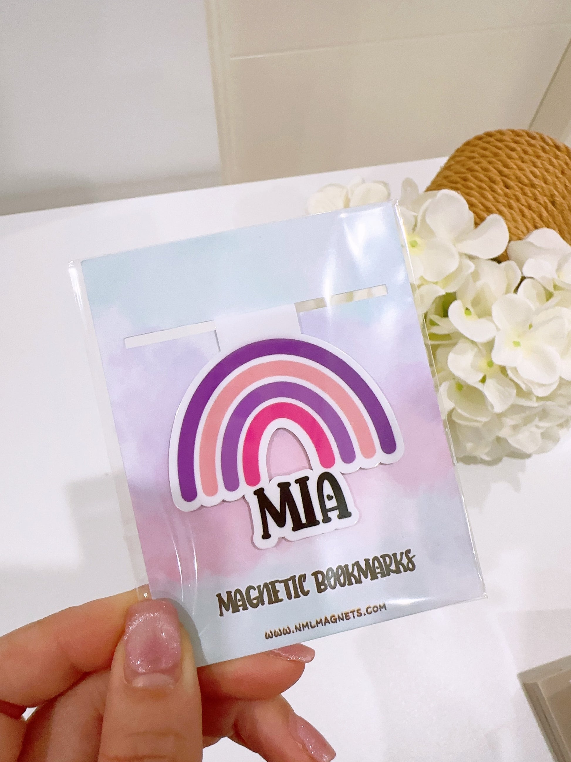 A Rainbow Personalized Name Magnetic Bookmark is a vibrant and functional bookmark that features a colorful rainbow design. The bookmark is customized with your name, making it a unique and personal accessory for book lovers.