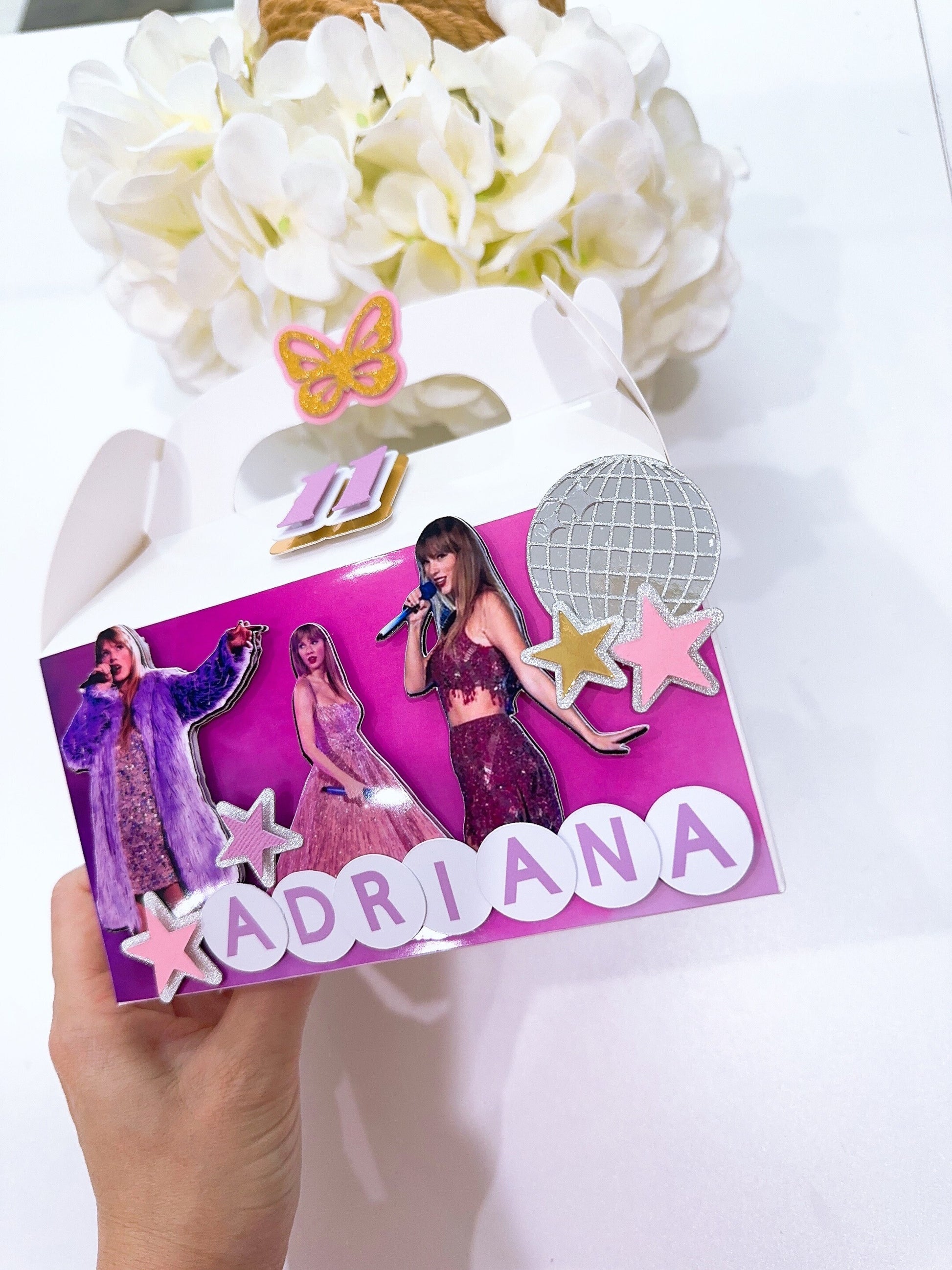 This handmade Taylor Swift 3D favor box is a great way to add a wow factor to your child's party. You can personalize this box by adding the name of the birthday child. Boxes has been made with good quality cardstock and amazing prints.